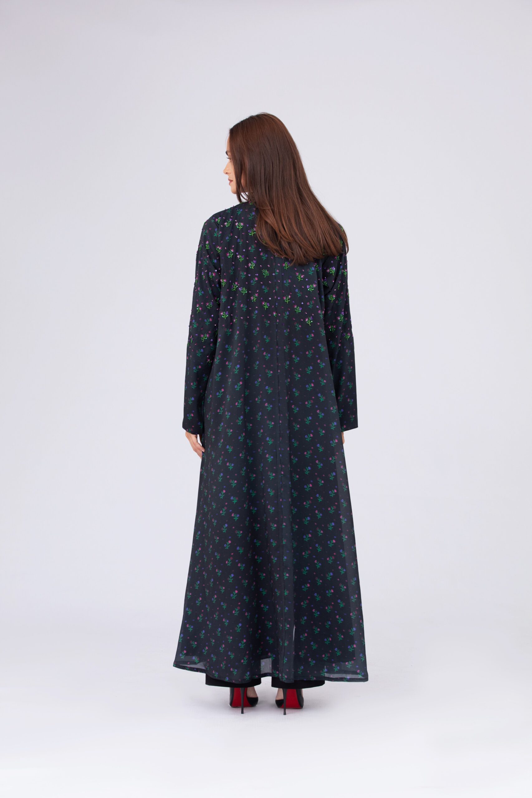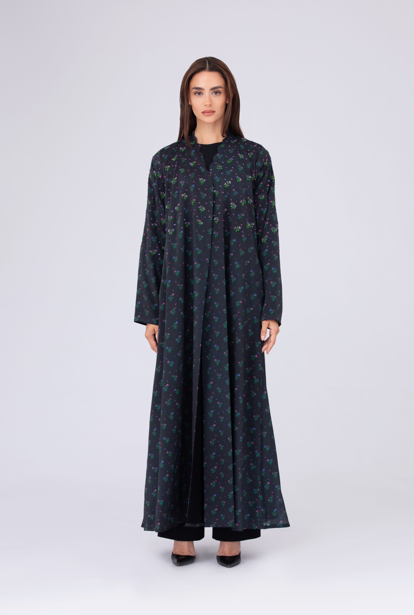 An abaya made from printed chiffon, adorned with delicate handmade scattered floral embroidery.