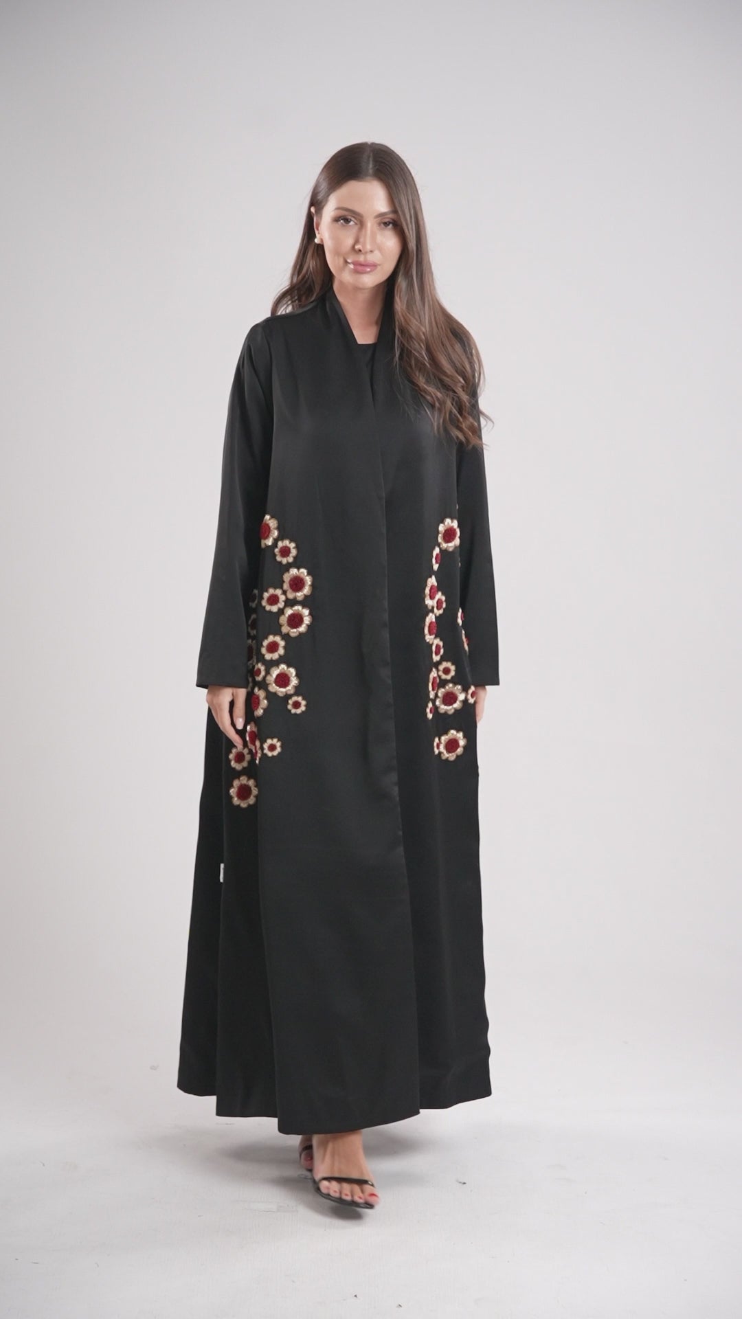 A luxurious abaya made from high-quality crepe, featuring heavy handmade embroidery with golden and deep red floral details. A refined design that combines elegance with subtle sophistication.